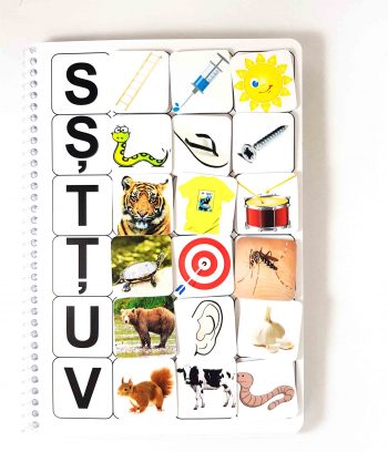 Caietul conține câte 3 imagini pentru fiecare literă din alfabet.